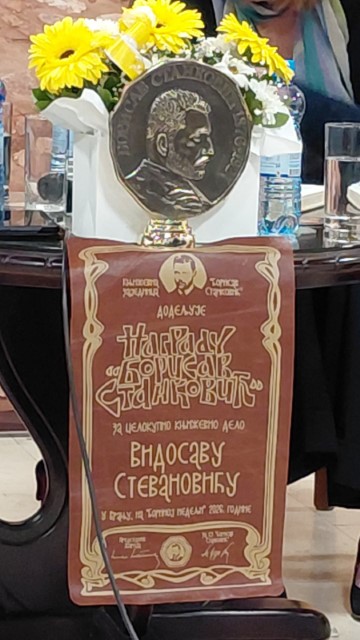 Награду „Борисав Станковић“, у виду барељефа са пишчевим ликом и новчанице, такође са ликом Станковића, Видосаву Стевановићу је уручио Мирослав Цера Михаиловић, главни и одговорни уредник Књижевне заједнице која носи назив по врањском писцу.