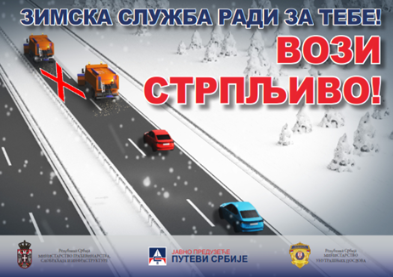 Апелујемо на возаче да без преке потребе не крећу на пут, а уколико крену да обавезно користе зимску опрему, стриктно поштују постављену саобраћајну сигнализацију и брзину кретања прилогоде условима на путу!